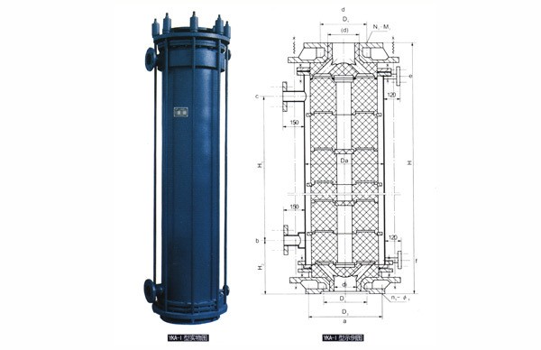 YKA型圓塊式石墨熱交換器以圓柱 體型單元積木式疊裝而成,結構強度高,石墨件間墊以四氟質或特種橡膠質等質 地密封件.密封可靠,設備導熱效率高,耐溫、抗沖擊、耐壓等性能優越。本型設備分成I型與II型,I型載熱體切向進入換熱塊,相鄰兩塊方向錯開,縱向物料經短 通逐塊再分配而紊流效應顯著,下封頭附 加氣液分離的則成冷凝器,若上封頭改成 蒸發室則形成蒸發器。YKA-II型載熱體徑 向進入換熱塊,殼體按外折
