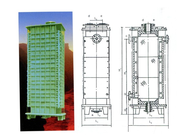 本型設備由單元吸收換熱塊積木式疊裝,塊間加四氟質(或特種橡膠質)密封墊。上部為氣體與吸收液進入及分布裝置底部為氣液分離器,輔以通流冷卻水 的鋼質殼體構成。結構強度高,抗熱沖擊 性好,傳熱效率高,檢修方便。YKX型只許輔以支座(用戶自配)安裝,MS型以 殼體上懸掛支座安裝。圖示為圓塊式石墨吸收器結構圖。技術特性: 縱向 橫向設計壓力Mpa ≤0.1 ≤0.4設計溫度℃ ≤170換熱面積㎡